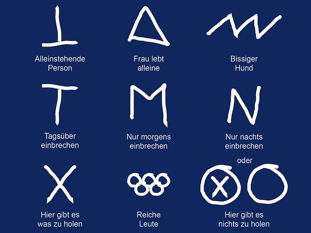 Die sogenannten Gaunerzinken fallen zwar nicht sofort ins Auge, dienen allerdings Einbrecherbanden seit jeher als Geheimcodes. Schon ein einfaches Kreuz kann darüber entscheiden, ob die Diebe in Ihr Haus einsteigen oder nicht. Die Botschaft lautet z. B. „Frau lebt alleine“ oder „In diesem Haus ist Geld vorhanden“. In der Praxis folgt auf den „Späher“, der die Beobachtungen und Markierungen macht, meist einige Zeit später der Beutezug seiner Einbrecherkomplizen. Wer beim Zeitung- oder Postholen ein ungewohntes Symbol im Eingangsbereich seines Hauses entdeckt, sollte ein Foto machen und die Zeichen schnellstmöglich entfernen; bei gehäuftem Auftreten raten wir außerdem die Polizei zu informieren. Die Kriminalpolizei hält umfangreiche Informationen z. B. auf der Webseite www.polizeiberatung.de bereit. In manchen Fällen haben auch Versicherer Experten, die, insbesondere Kunden mit hochwertigem Hausrat, vor Ort kostenfrei ein individuelles Sicherheitskonzept erstellen. Ebenso haben wir Empfehlungen, welche mechanischen und elektronischen Sicherungen für Ihr Grundstück bzw. Haus sinnvoll wären. Schon eine einfache Grundstücksumfriedung schreckt z. B. viele Täter ab.